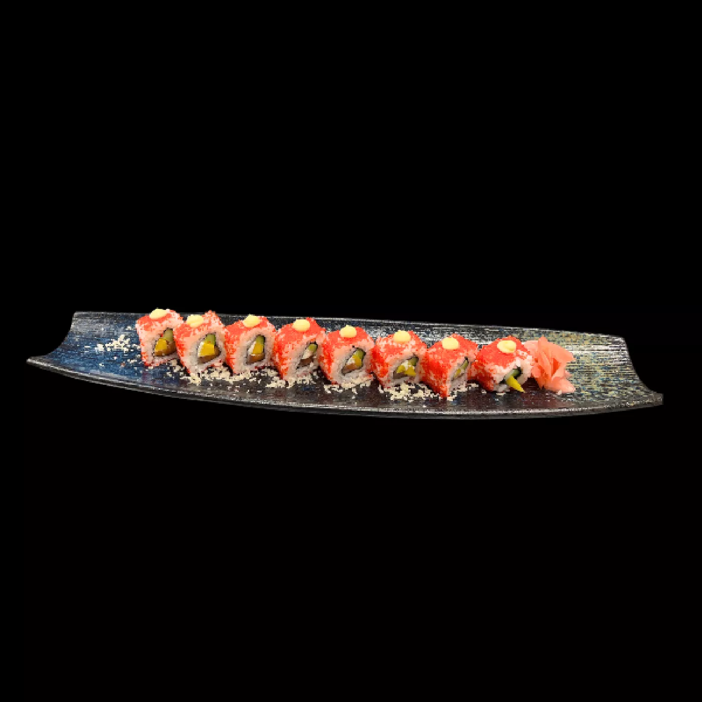 O combinație vibrantă de somon, mango și cremă de brânză, într-un rulou care aduce energie la fiecare îmbucătură. / orez fiert simplu pentru sushi 108g (apă 144g, orez sushi 54g, sare 3,6g), somon 36g (alergen: pește – D), brânză proaspătă cremă 23g (alergen: lapte – G), mango 18g, ghimbir murat roz 18g, amestec wasabi sushi 14g, icre tobikko roșii 11g (alergen: pește – D), maioneză japoneză 7g (alergen: ou – C, muștar – M), alge nori silver întregi 3g. Aditivi: E-412, E-129, E-110, E-621, E-163, E-300, E-102, E-133. Alergeni: pește – D, lapte – G, ou – C, muștar – M. Declarație nutrițională per 100g: energie 1086 kJ / 261 kcal, grăsimi 17,1 g, acizi grași saturați 5,2 g, glucide 11,8 g, zaharuri 1,6 g, proteine 10,2 g, sare 1,36 g.  / 235g