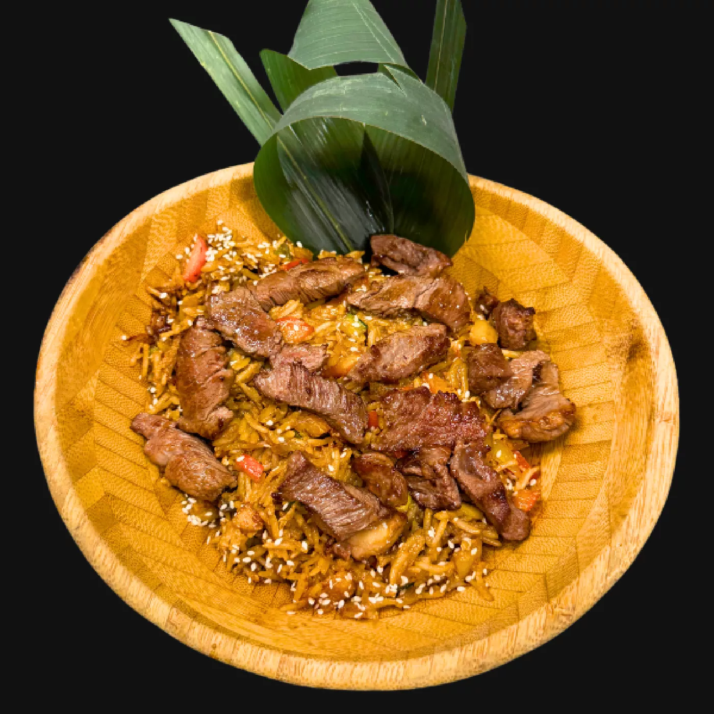 Orez prăjit la wok împreună cu vită și legume, servit cu arome echilibrate și textură plăcută. / orez basmati 180g, mușchi de vită 90g, ouă 50g (alergen: ou – C), ardei gras mix 50g, praz 23g, ciuperci 23g, morcovi 18g, ceapă roșie 18g, varză chinezească 18g, ceapă albă 18g, ulei de măsline extravirgin 18g, sos teriyaki Genki 18g (alergen: soia – F, gluten – A), sos soia 14g (alergen: soia – F, gluten – A), ceapă verde 9g, susan alb 4g (alergen: susan – N), sare 2g, piper negru măcinat 1g, condimente chili 7 spices 1g, ghimbir 1g. Aditivi: E-536, E-1510, E-621, E-415, E-150D, E-202. Alergeni: ou – C, soia – F, gluten – A, susan – N. Declarație nutrițională per 100g:energie 815 kJ / 195 kcal, grăsimi 10,2 g, acizi grași saturați 3,2 g, glucide 14,4 g, zaharuri 2,4 g, proteine 10,4 g, sare 1,4 g / 360g.