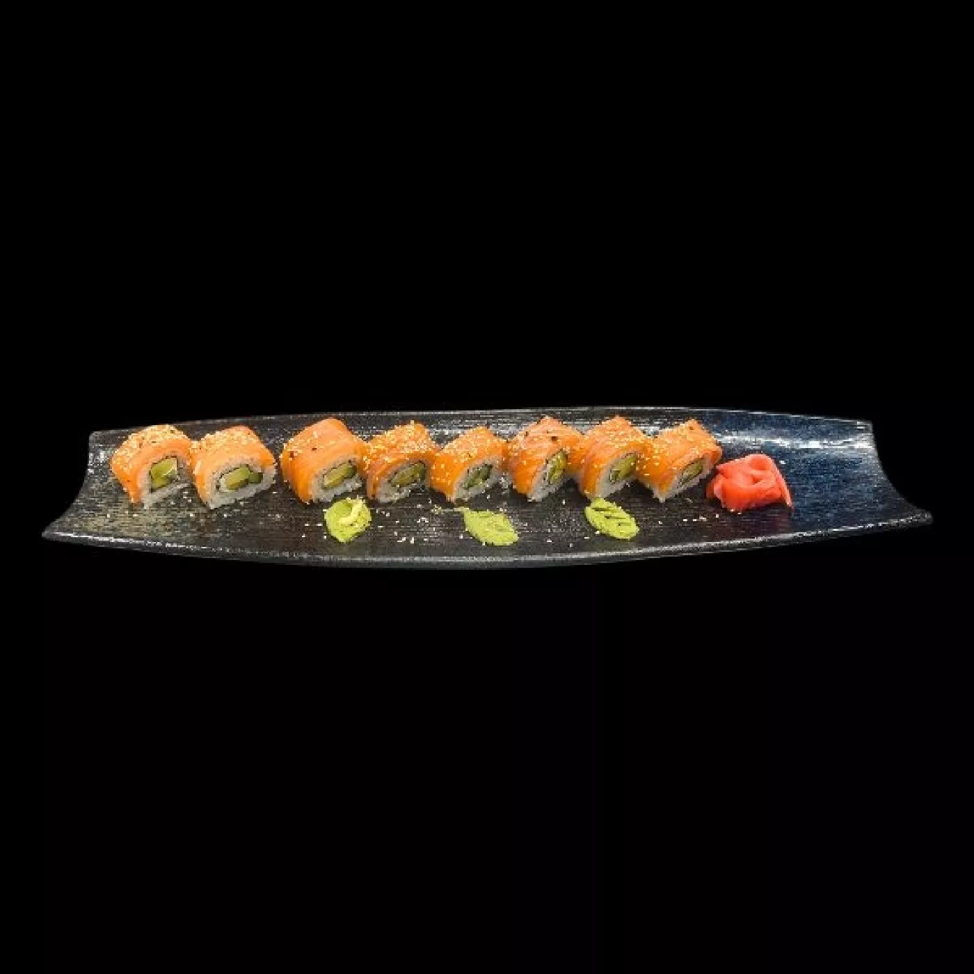8 bucăți care combină somon, cremă de brânză și legume proaspete, într-un echilibru perfect. /orez fiert simplu pentru sushi 108g (apă 144g, orez sushi 54g, sare 3,6g), somon 36g (alergen: pește – D), brânză cremă proaspătă 32g (alergen: lapte – G), mango 18g, sos teriyaki Genki 18g (alergen: soia – F, gluten – A), ghimbir murat roz 18g, castraveți 18g, avocado 18g, amestec wasabi sushi 14g, maioneză japoneză 7g (alergen: ou – C, muștar – M), alge nori silver întregi 3g. Aditivi: E-412, E-621, E-415, E-150D, E-202, E-300, E-102, E-133, E-163. Alergeni: lapte – G, pește – D, ou – C, muștar – M, soia – F, gluten – A. Declarație nutrițională per 100g: energie 794 kJ / 190 kcal, grăsimi 10,2 g, acizi grași saturați 3,2 g, glucide 14,9 g, zaharuri 2,8 g, proteine 9,1 g, sare 1,3 g / 270g.