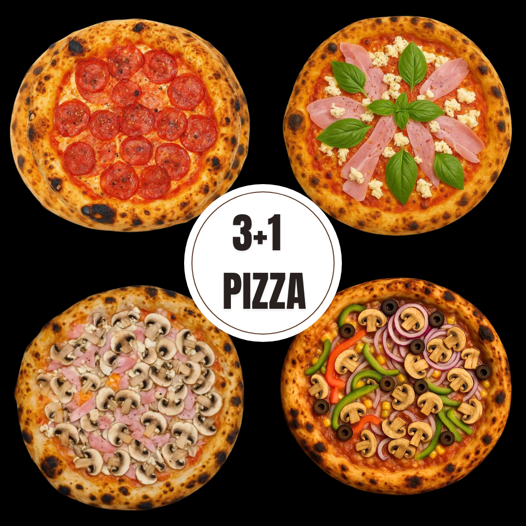 Contine: Pizza Diavola 30 cm, Pizza Prosciutto Cotto & Buffala 30 cm, Pizza Prosciutto e Funghi 30 cm, Pizza Vegetariano 30 cm. Gramaj: 1560g. Pentru detalii legate de ingrediente, valori nutritonale si alergeni va rugam verificati categoria PIZZA & FOCACCIA.