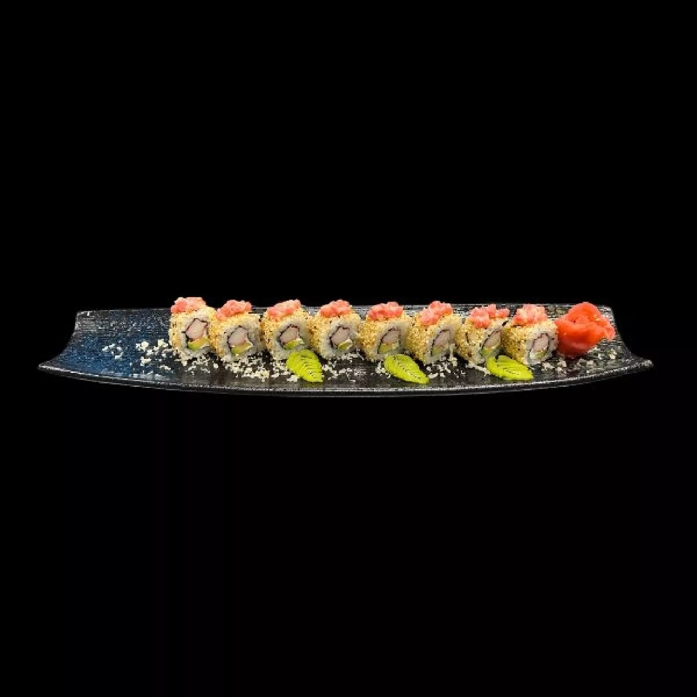 Ton, avocado și brânză cremoasă, într-un rulou care combină prospețimea cu un val de arome îndrăznețe. / orez fiert simplu pentru sushi 108g (apă 144g, orez sushi 54g, sare 3,6g), ton roșu 36g (alergen: pește – D), surimi 36g (alergen: pește – D, crustacee – E), brânză proaspătă cremă 23g (alergen: lapte – G), avocado 18g, ghimbir murat roz 18g, amestec wasabi sushi 14g, maioneză japoneză 7g (alergen: ou – C, muștar – M), alge nori silver întregi 3g. Aditivi: E-621, E-526, E-412, E-300, E-102, E-133, E-163, E-451, E-450, E-420, E-407, E-421, E-640, E-170, E-120, E-160. Alergeni: pește – D, crustacee – E, lapte – G, ou – C, muștar – M. Declarație nutrițională per 100g: energie 769 kJ / 184 kcal, grăsimi 9,2 g, acizi grași saturați 2,6 g, glucide 14,4 g, zaharuri 2,2 g, proteine 9,5 g, sare 1,4 g / 250g.